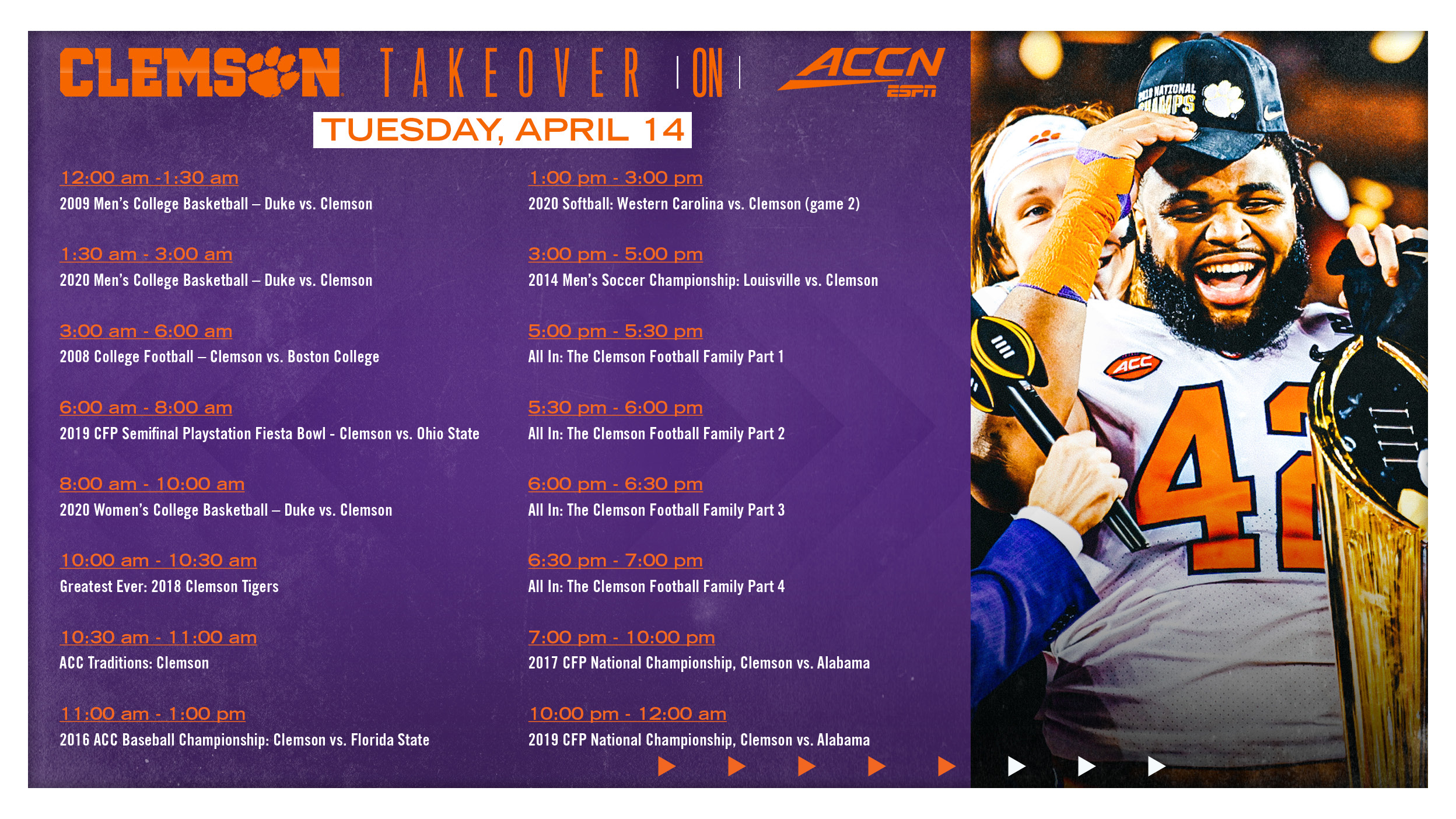 Clemson won 62-17 on Dec. Listen online or download the iHeart App. The television broadcast for the first game will come via ACC Network.